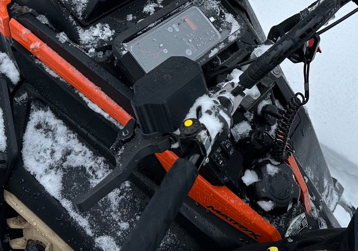 Sont inclus avec le coffret: un ensemble de fixation RMK ainsi qu’un cordon d’alimentation USB se branchant directement à la prise d’accessoires de la motoneige. Le cordon d’alimentation vous permet de maintenir la batterie de votre téléphone chargée en tout temps et de produire la chaleur nécessaire pour empêcher la formation de buée.
